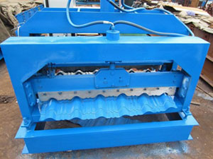 1050型琉璃瓦压瓦机分为三部分,辊道成型部分、压型部分、切刀部分。辊道成型部分是由电机拖动,链条带动各辊转动。压型部分是液压缸带动模具上下移动,可以把彩钢压成许多节,形似琉璃瓦。切刀部分是液压缸带动刀具上下移动,可以把彩色钢瓦切断。